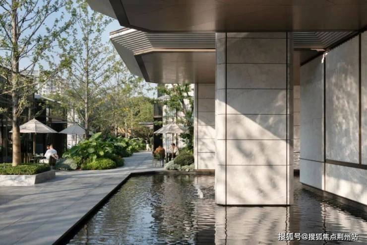 利用建筑挑檐延伸架空层边界,实现室内外空间的互通,结合植物、水景等自然空间进行打造,景观、建筑、室内被完整的脉络统一牵引,形成项目底盘中的亮点空间。
