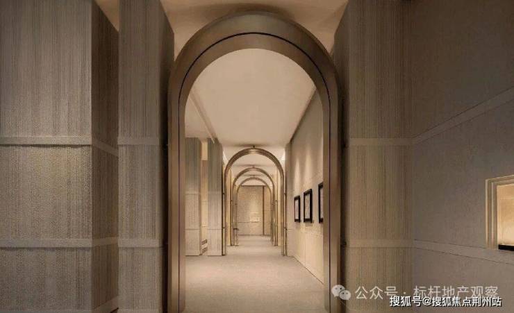 项目大门内外两重门厅景墙运用月光米黄石材近1000 方,搭配香槟金金属线条,汲取爱马仕全球旗舰店的双曲面叠墙造景手法,增加景墙奢华质感。