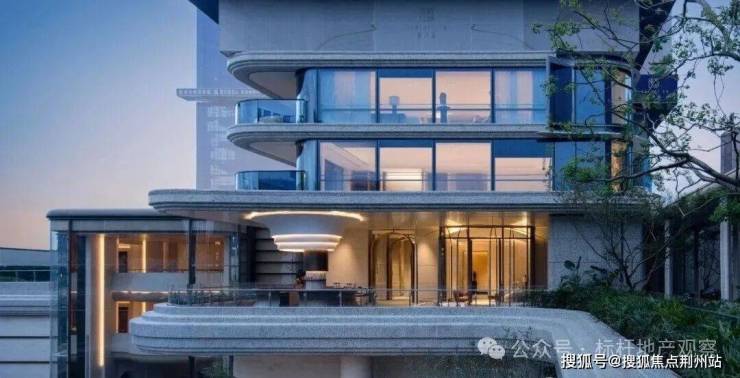杭序府的外立面采用弧线转角阳台+蓝灰色钢化LOW-E玻璃,公建化立面拥有超高窗墙比。同时,大量曲线元素的运用,不仅造价昂贵,而且极具辨识度,成为区域的颜值担当。