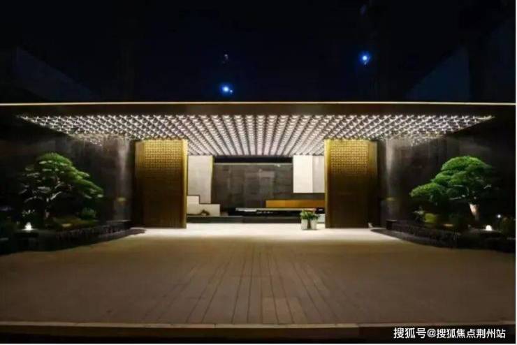 步入社区,约95米长的西大门长廊率先映入眼帘,乱纹黄古铜饰面与深色奢石大理石碰撞,顶部金属铝板立体切割,彰显归家仪式感!大门内侧,照壁以中国黑石材与青白石组合,延续空间礼序!