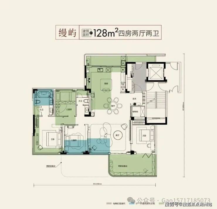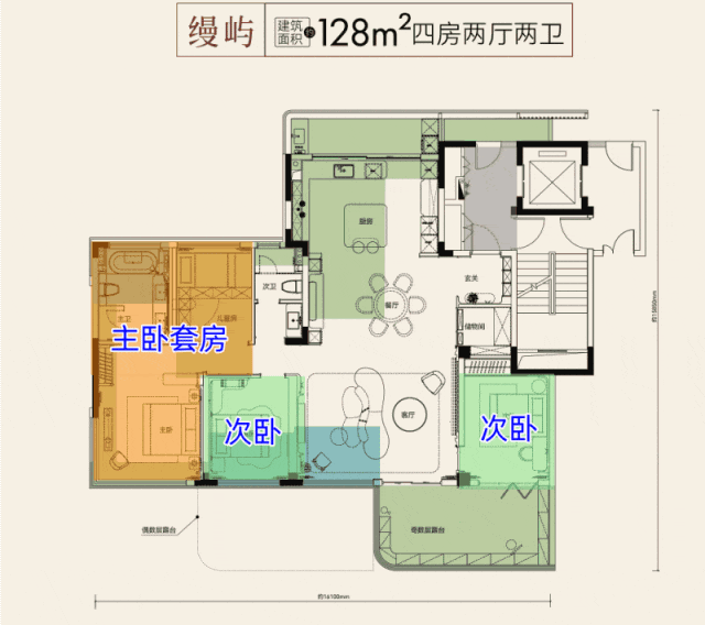 该户型还做到了四开间朝南,完全南北通透,南向露台+北向休闲平台,实现一房3花园的格局;主卧南北贯通,老人房与其他房间有很好的空间隔离,避免了生活作息不同带来的干扰,私密性更好。