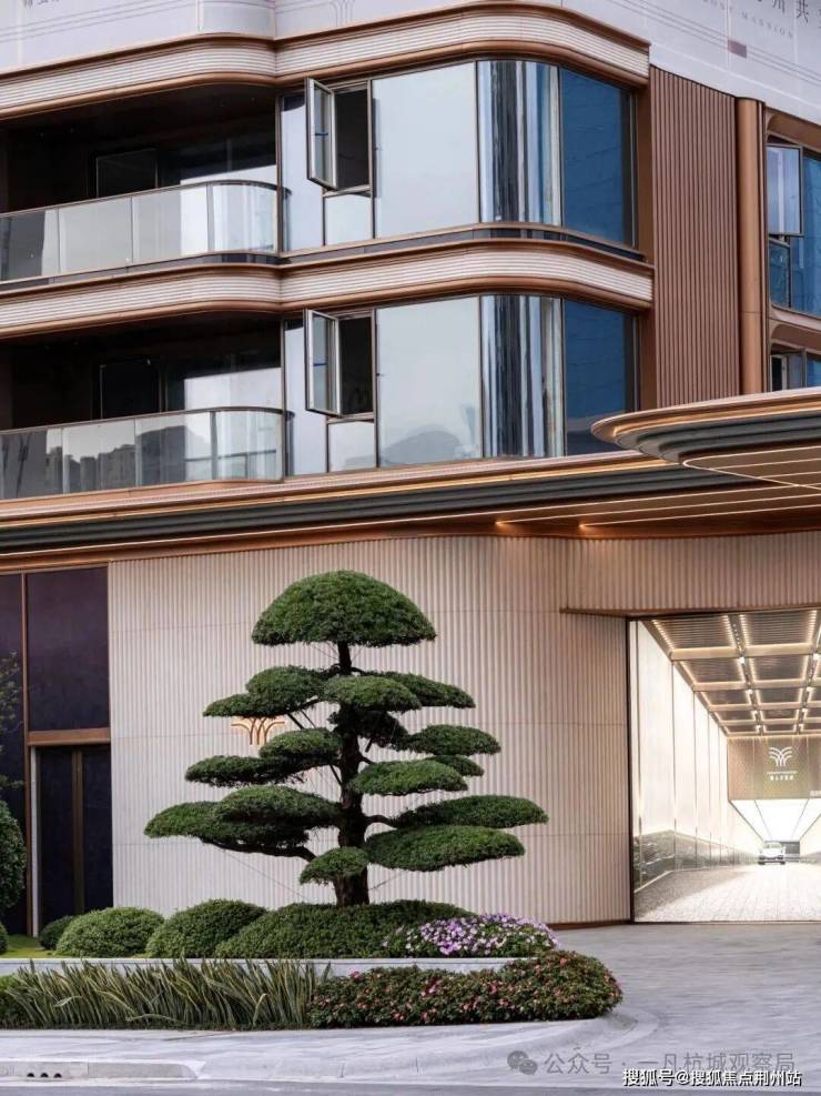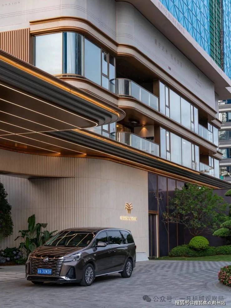 小区外立面采用香槟金铝板+玻璃幕墙+浅色石材,门厅用水纹大理石打造,整体呈现“酒店式归家大堂”质感。