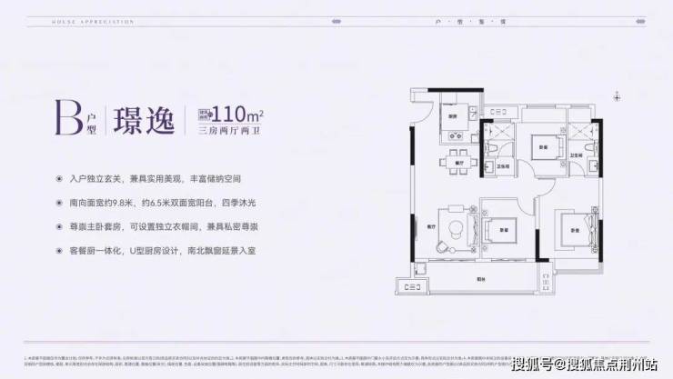110㎡户型为三开间朝南,采光充足。客厅宽敞,连通餐厅,动线合理。主卧套房带独立卫生间和飘窗,舒适私密。厨房U型或L型布局,操作便利。卫生间满足家庭使用需求。户型整体空间利用合理,配备精装修及智能家居,小区配套完善,适合刚需及改善型家庭。