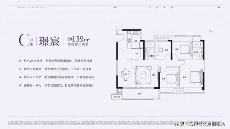 139㎡四房双卫则专为改善家庭打造,大气横厅连接观景空间,双卫设计避免早晚高峰的尴尬,各功能区互不干扰,满足多代同堂的居住理想。