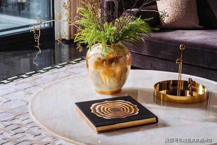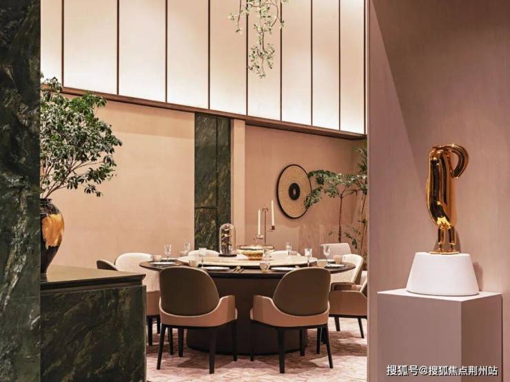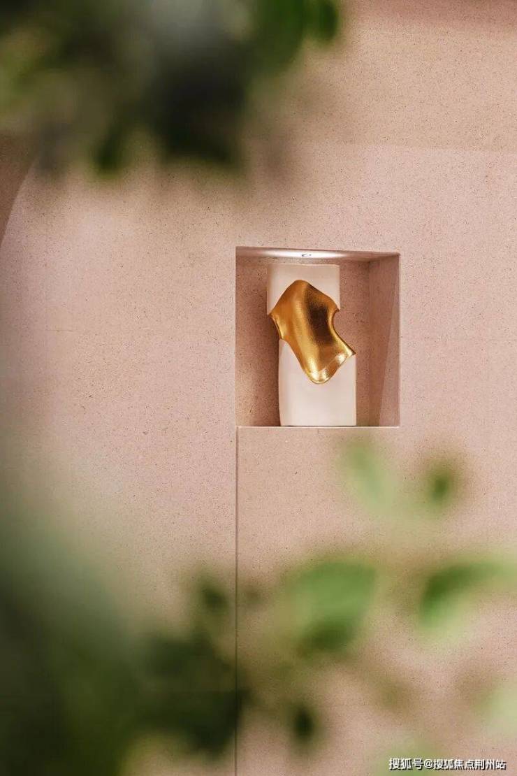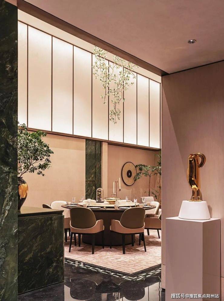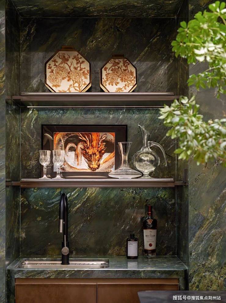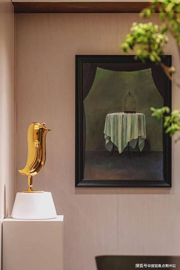 戴勇设计的软装方案堪称“可居住的艺术”。负二层家宴及社交空间以绿色水晶定制的大型花瓣吊灯,与西班牙艺术家亚米海因的金色小鸟碰撞出时空涟漪;主卧床头背景墙的金箔艺术画,在灯光下流转出银河般的星辉。