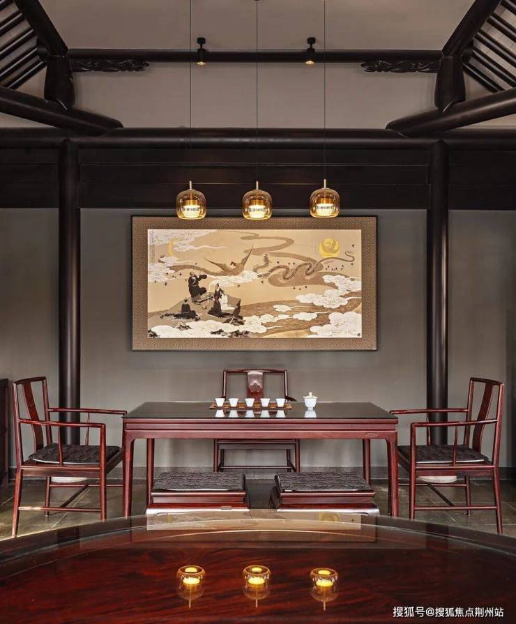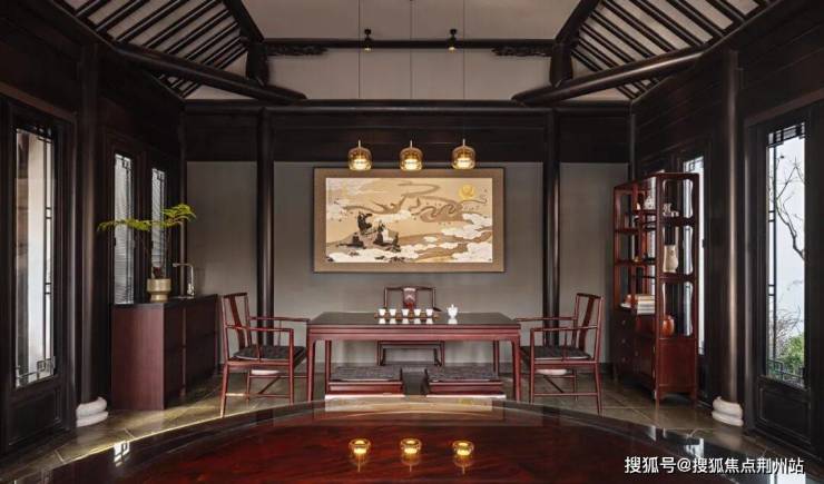 水榭悬挑于水面,可俯瞰水中倒影,可观赏游鱼,还可抚琴品茗下棋书画闻香,不失清雅之境。水榭“暖阁”家宴厅由传统建筑营造方式建造,坡顶梁柱结构。三面落地门窗,可开可合。在此品茶论道,宴请宾客,“谈笑有鸿儒,往来无白丁”。茶桌背景墙的挂画来自当代画家、山东画院院长孔维克的《一山一水一圣人》。