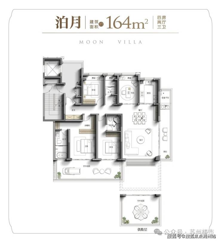 建面约162-164㎡四代洋房,以奇偶错层布局,为每户呈现全南向约21-22㎡空中露台,将庭院向上生长。