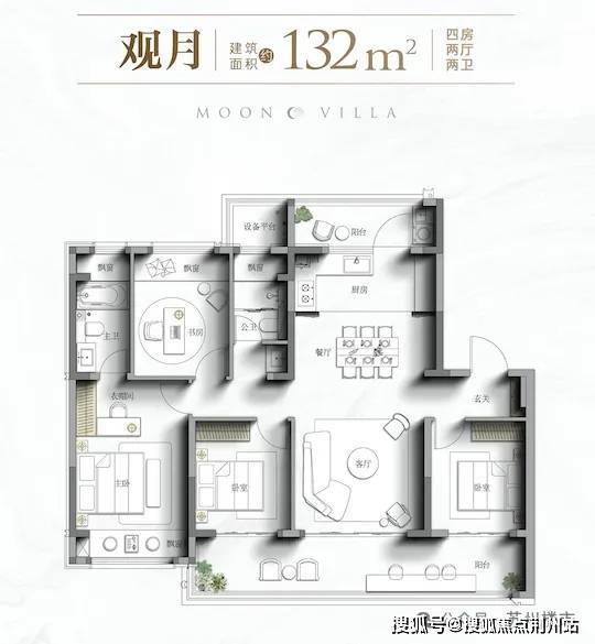 建面约132㎡洋房,约13.4米面宽,南北双阳台+飘窗赠送近20㎡,三开间阳台。