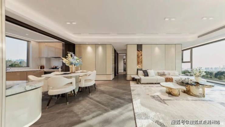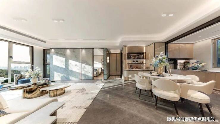 精装的重设:建发为了给到业主更好的居住体验,在精装时考虑到后期改造需求,比如大多户型餐客厅及阳台地面采用超大尺寸瓷砖通铺,吊顶同样从餐客厅延伸至阳台,连背景墙岩板都将阳台纳入在内。