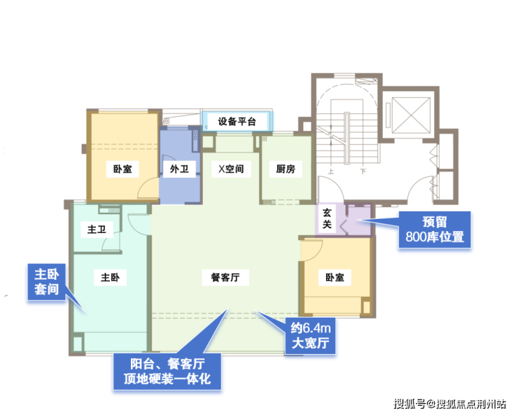 ④南向宽屏阳台+北向设备平台:北向设置设备平台,流畅通风;南向约6.4米宽超大阳台,可晾晒、可赏景。