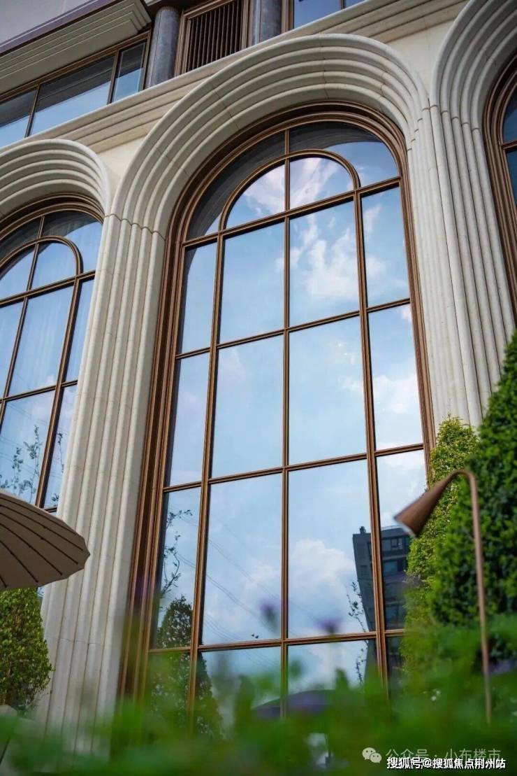 石材基座配宝格丽绿奢石拱门,仿石铝板搭古铜线条,像给建筑装了“油画框”,高级感拉满。