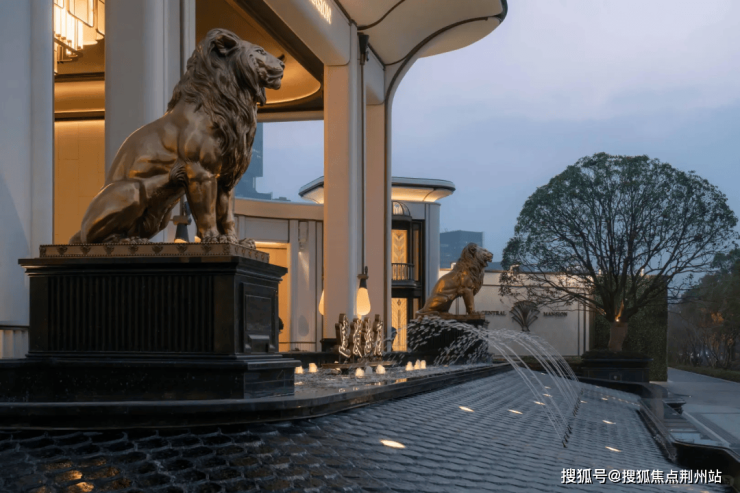 65米环抱式落客前场,灵感来源于“上海豫园-湖心亭九曲桥”,双尊威严铜狮静立,双株名贵金桂伫立,环抱一汪“尊华瑞鳞”水景,寓意流水生财,奠定尊奢门仪。
