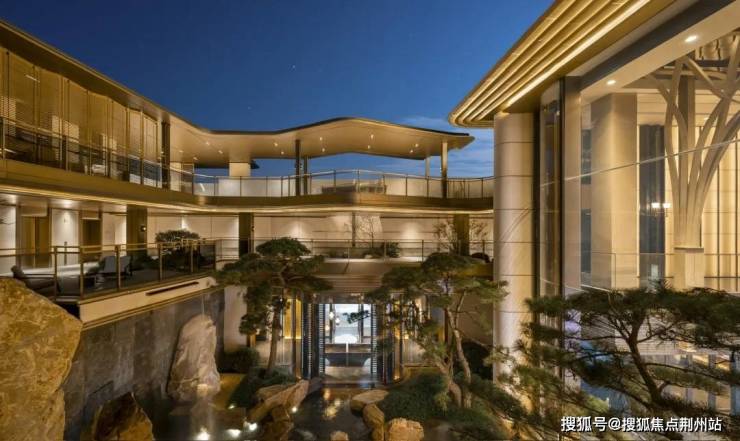 五重归家」轴线串联宽约128米恢弘门庭、约15米叠石飞瀑、约13米榫卯转译的现代穹顶等。约1300㎡下沉式庭院采用三层立体观景设计,15米叠石飞瀑再现《溪山行旅图》的山水意境。