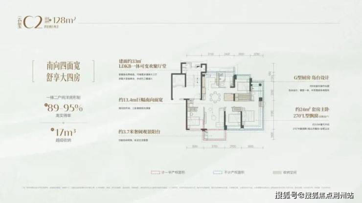 这款是项目的王牌户型。赠送7飘窗+双阳台,全屋储物空间高达17m³。约13.4米的南向四面宽,三卧朝南;约33㎡的LDKB一体化聚厅,客餐厨阳台贯通,动线一气呵成;约24㎡的主卧套房,边户还带270°L型飘窗。实得率高达89%-95%,创造出媲美160㎡产品的空间感受。