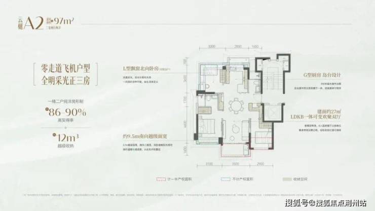这款户型采用零走道飞机户型设计,方正通透无浪费。赠送4飘窗+双阳台,三开间朝南,客厅面宽约3.5米。配备了通常大户型才有的八百库、岛台、餐边水吧台,全屋加起来有12m³的储存空间,大约相当于80-100个28寸行李箱的容量。实得率高达86%-90%,相当于常规109㎡产品的使用体验。