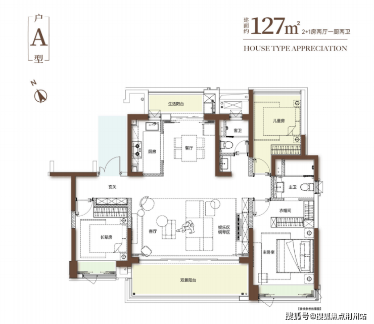 具体来看,建面约127㎡三房,三开间朝南,南向约13米采光,带独立入户玄关,LDKG+X大宽厅设计,客厅开间约6.5米,尺度还不错。
