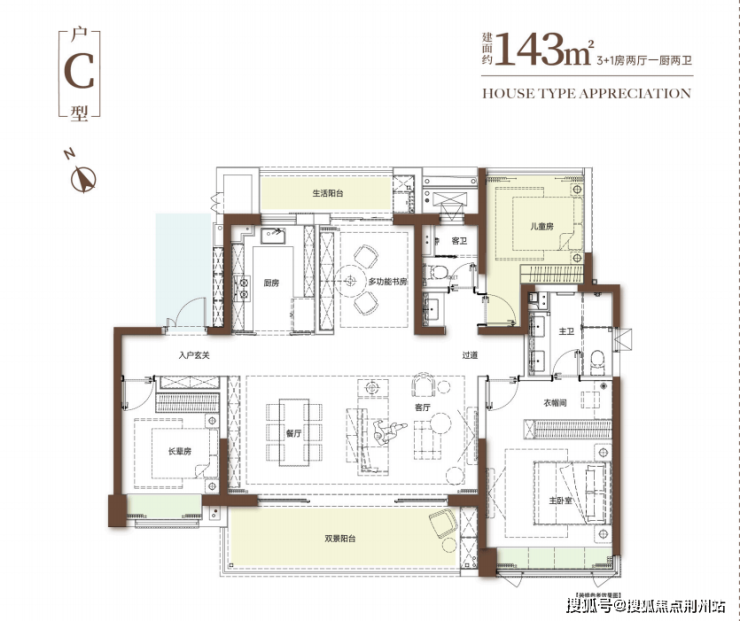 建面约143㎡四房,大横厅设计,带等宽约7.3米大阳台,U 型厨房与多功能书房相连,还带有生活阳台,可实现南北对流;主卧套房带转角飘窗+步入式衣帽间,居住体验感佳。