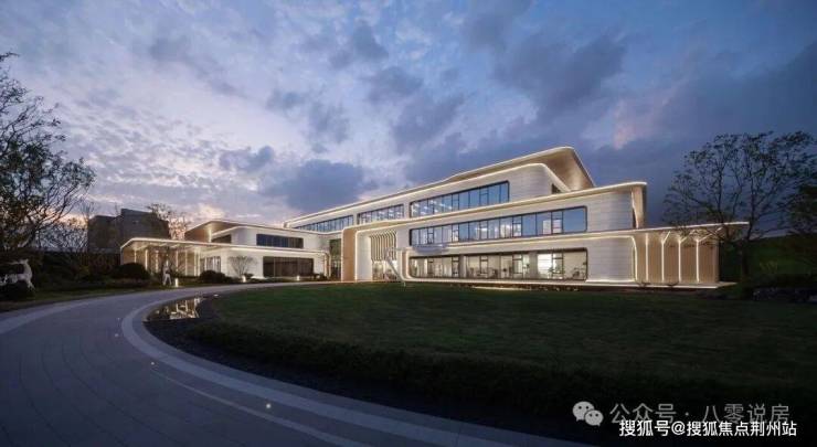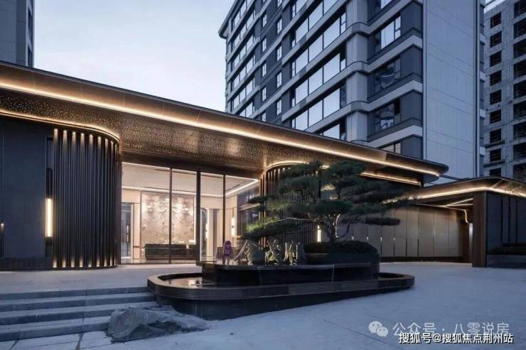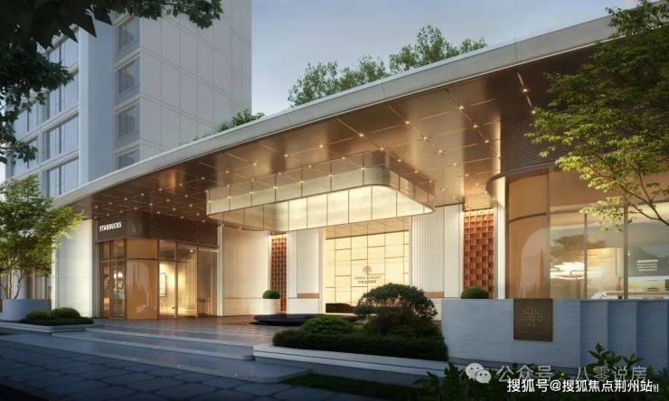 高阶美学:33米宽奢挑檐入户门厅,米白基底加透光云石,兼具艺术与仪式感;石材、铝板、幕墙...公建化外立面.