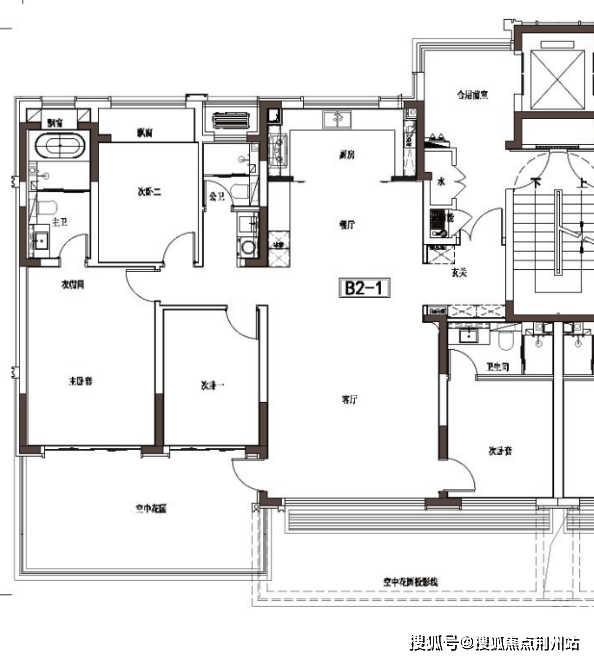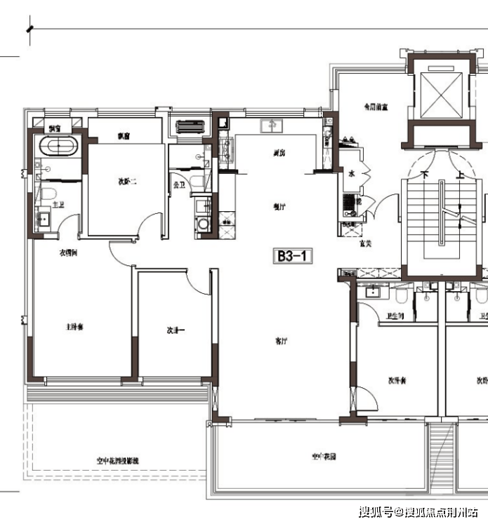项目中的四代洋房户型,设计了“错层双花园”系统:偶数层配备南向私密花园直连主卧,奇数层则设置社交花园衔接客厅。户型拥有约16.65米的南向超大面宽,采用LDKB一体化横厅设计,并配置双套房,得房率非常高。