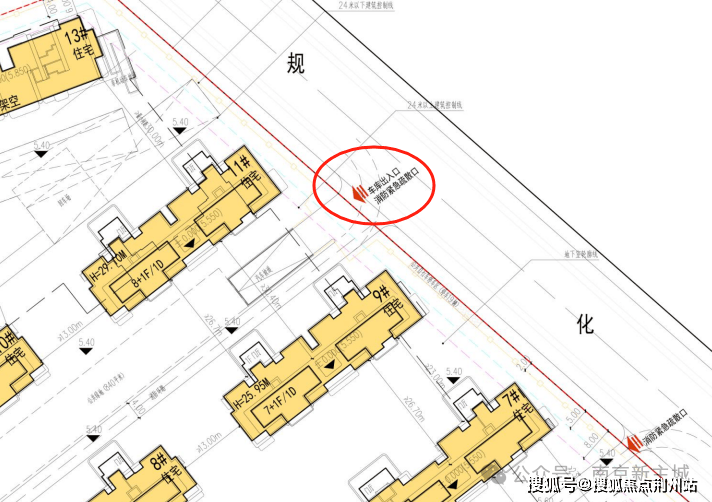 南边设置了一个主入口,主入口两边还设置了两个人行出入口,如下图所示