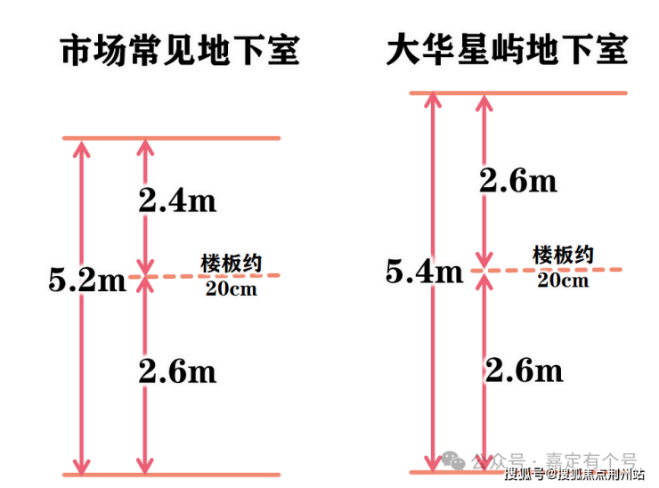 别小看这约20公分——传统地下室约5.2米,搭完楼板只剩约5米,分成约2.4米和约2.6米两层,约2.4米那层活动非常压抑,基本只能储物。