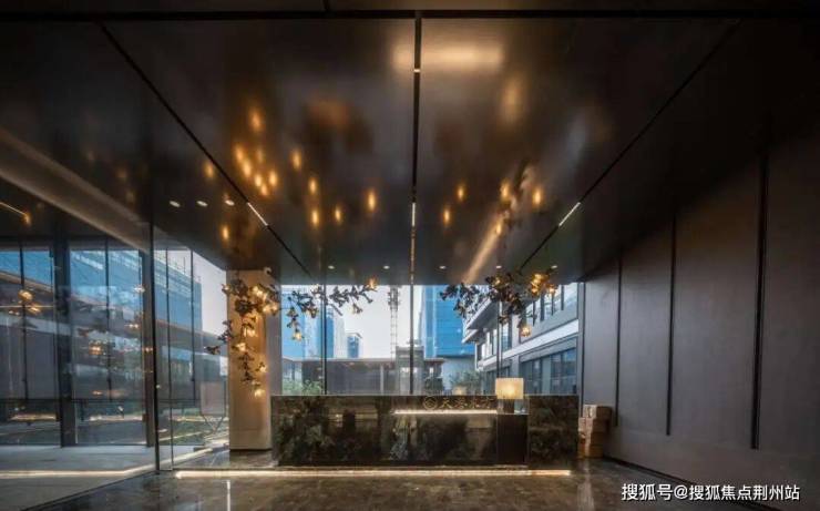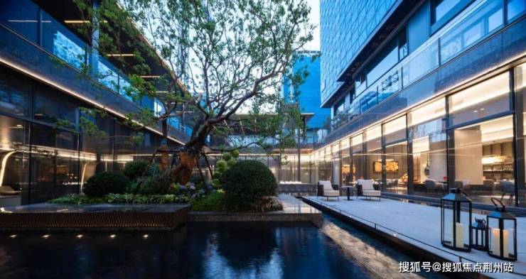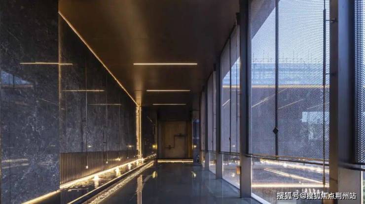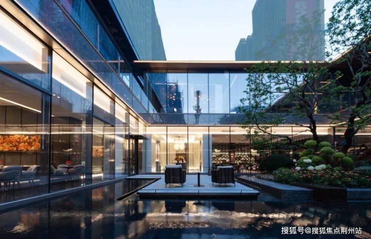 下沉式庭院巧妙布局了一片广阔的景观水域,象征着“将江水引入园中”,其周围环绕着清澈透明的玻璃幕墙和质感独特的黑耀灰大理石墙面,形成一幅宁静而庄严的景象。
