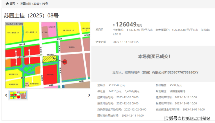 招商湖东8号地块项目,即,苏园土挂(2025)08号地块,位于工业园区钟南街东、苏州大道东南,是2025年12月11日招商以总价126049万元竞得,成交楼面价27342元/平,溢价率2.02%。