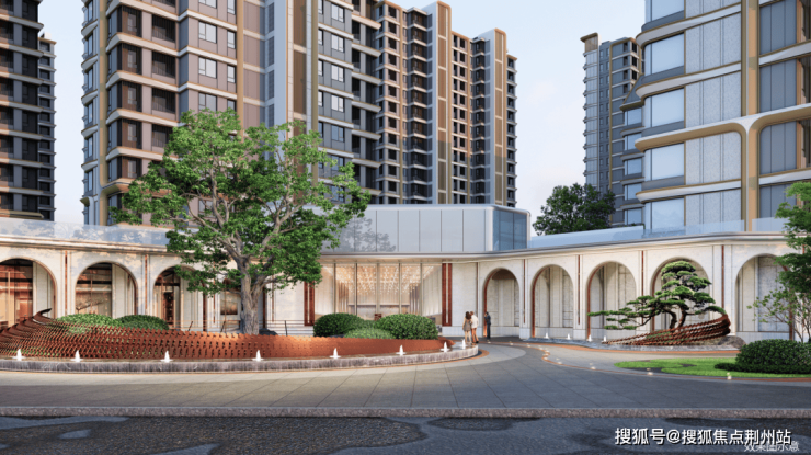 从古树山门进入社区,通过架空层会所+下沉水院,穿过山壁悬瀑,还升级打造了中央景观组团。