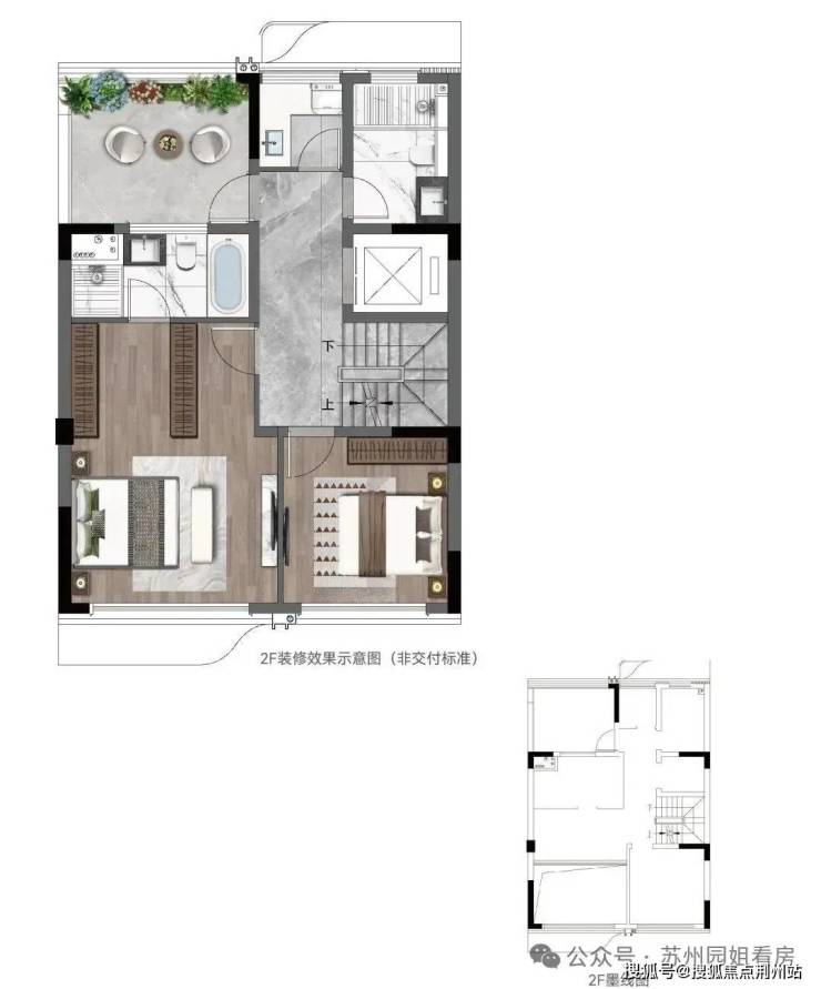 三楼也是双套房,朝北带露台,并且顶楼还送一个大露台(无需二次改造)。