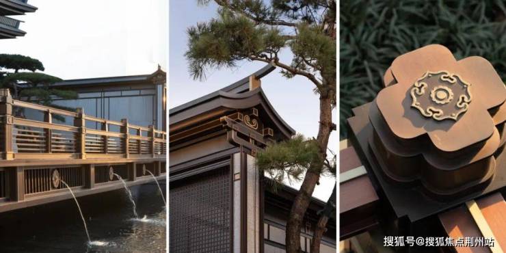 青墨建筑设计在材质选择上采用朱红色不锈钢和白金石材营造赤白的唐风氛围,由槅扇门演变而来的咖色格子窗施于殿堂门两侧各间的槛墙上,片墙做法原型取自杭州余杭径山寺的照壁,搭配在唐代角柱的基础上进行柔化的朱红。朱红缆柱,朱漆勾金,为恢弘的整体形构增添了细节的精致秀美。