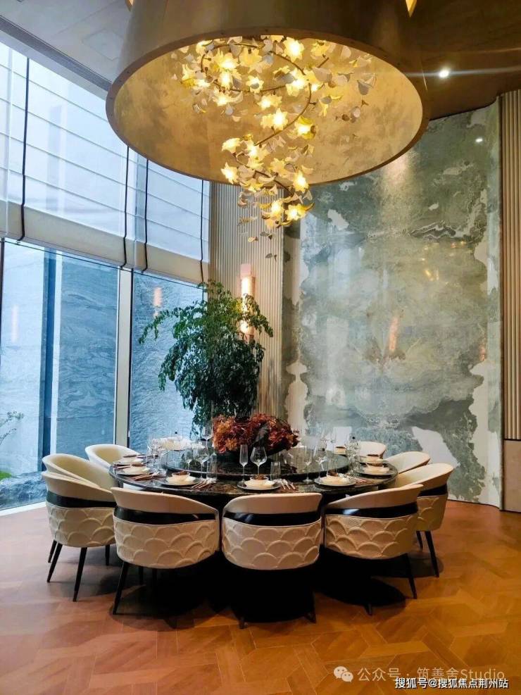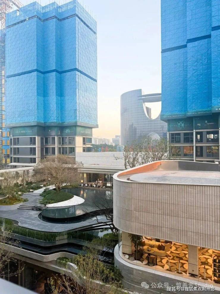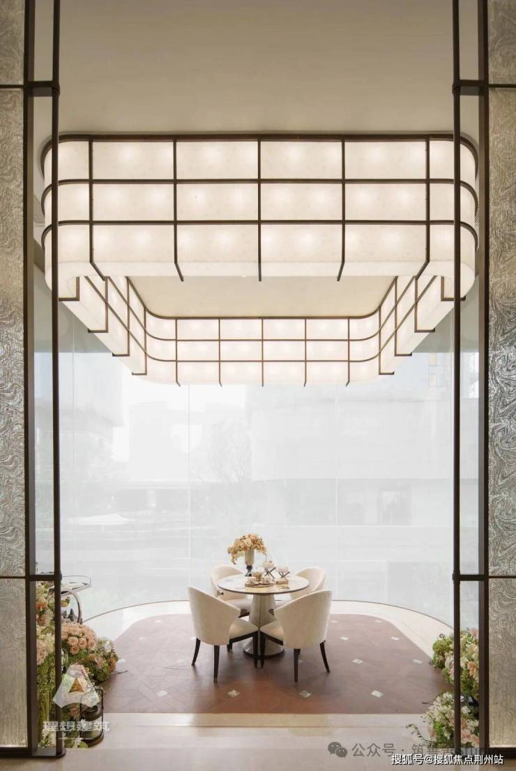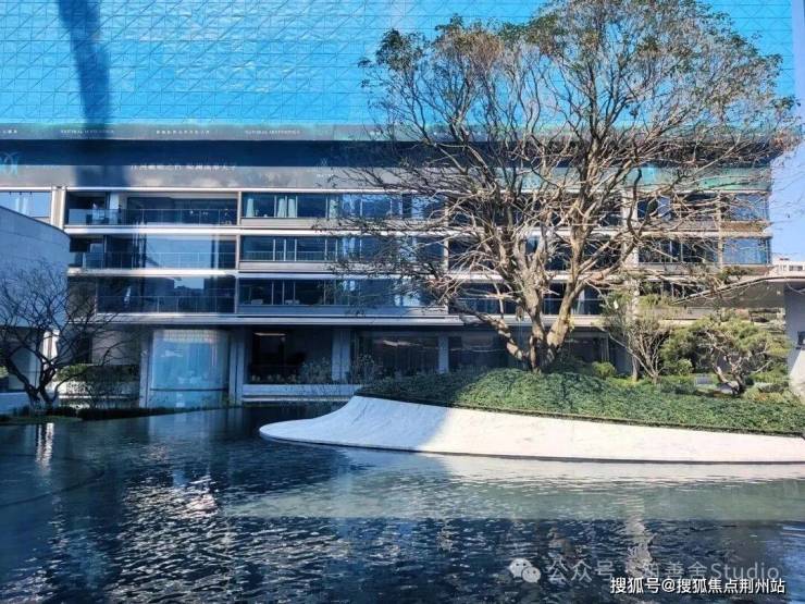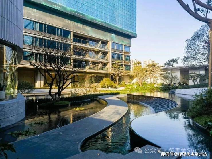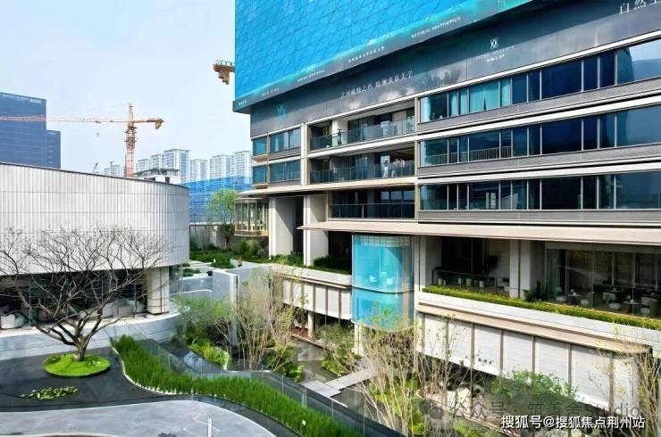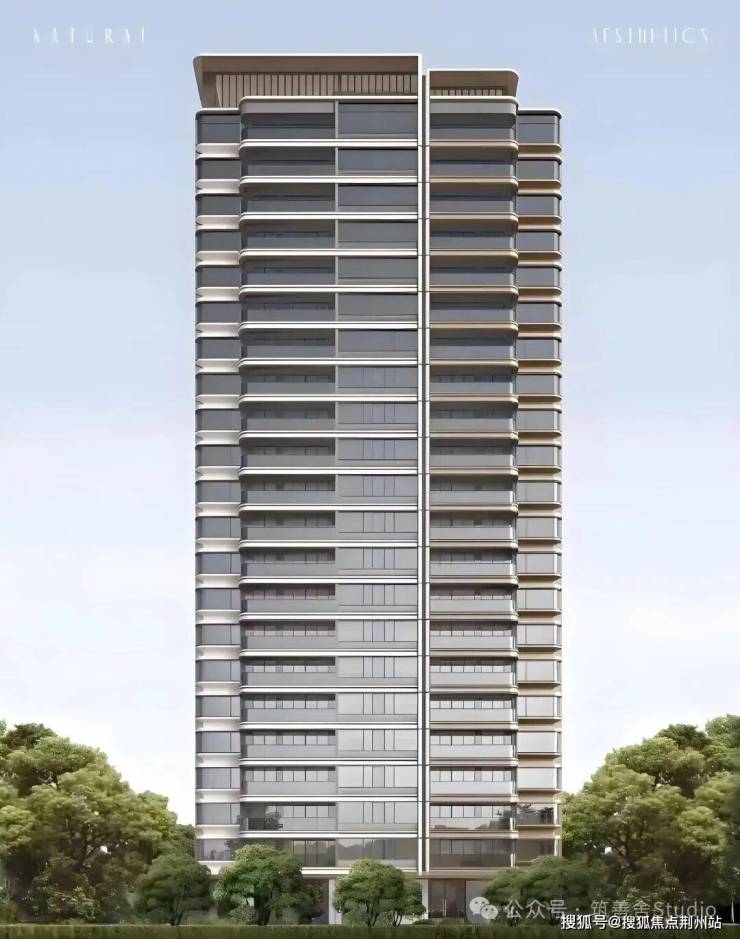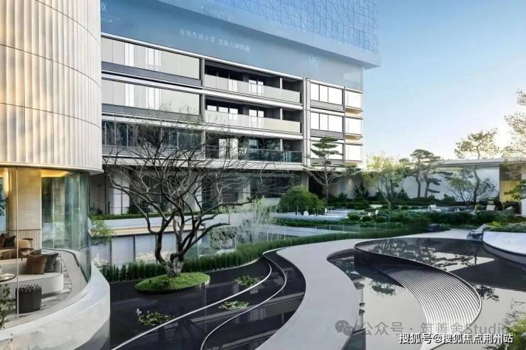 外立面以灰白色玻璃幕墙为主调,点缀金色线条,叠墅采用流线型曲面设计,巧妙呈现江潮金澜的意境。