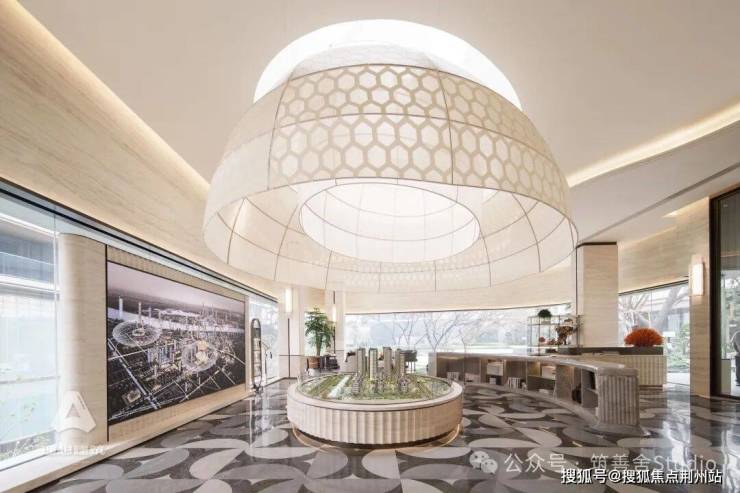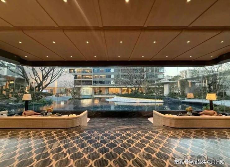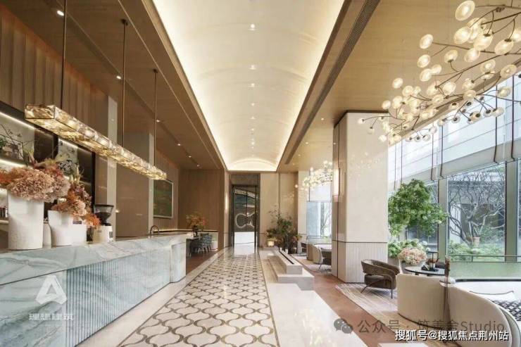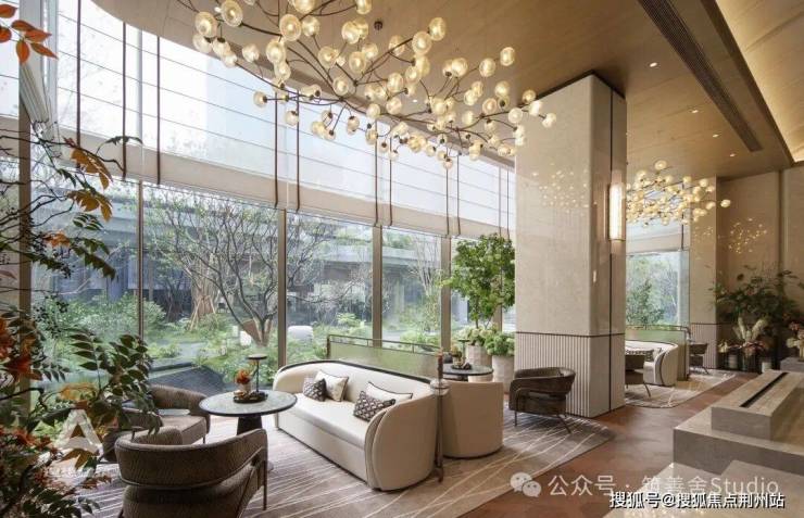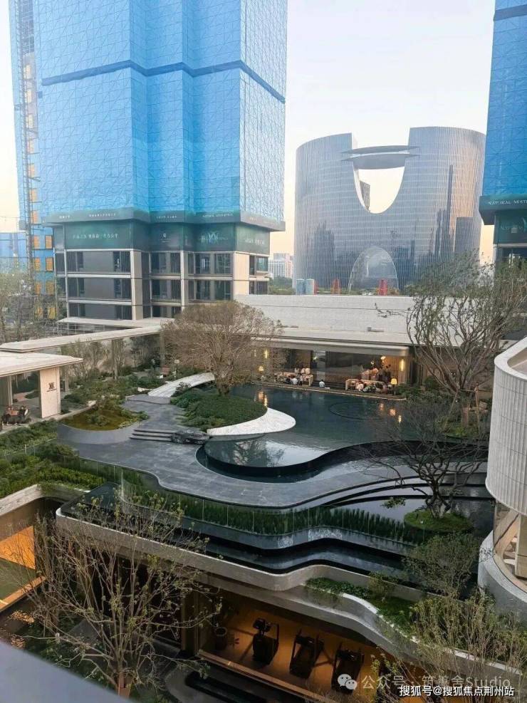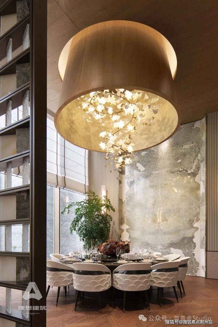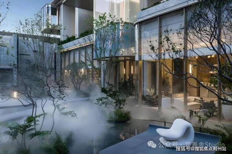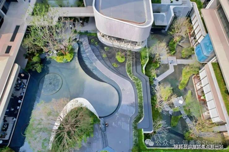 外立面以灰白色玻璃幕墙为主调,点缀金色线条,叠墅采用流线型曲面设计,巧妙呈现江潮金澜的意境。