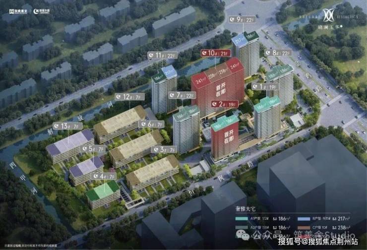 总占地8.2万平方米,建筑面积21万平方米,容积率仅2.0,绿化率35%,规划1200余户,涵盖11层洋房与18层小高层,其中7栋建面约186-241㎡奢雅大宅、6栋建面约237-364㎡水岸叠排全部为一梯两户或两梯两户设计,高层标准层层高3.15-3.3米。