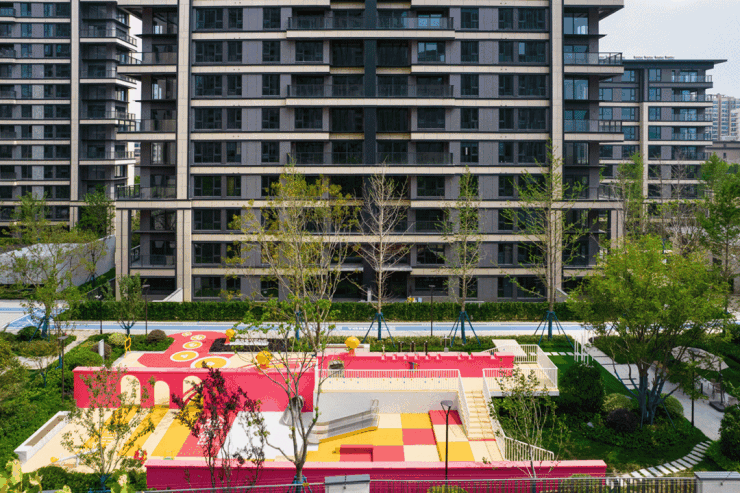 高级灰为主基调的外立面色彩,搭配局部橙色线条点缀,远远看去颇有一种天然的“鎏金镀银”的贵气。