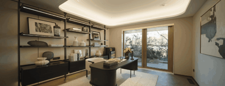 在256㎡的偶数层样板房中,开发商巧妙利用同一客厅空间,通过 场景化定制 规划出两个功能区域: 沙发会客区 与 开放式办公区。