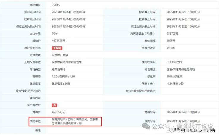 地块位于牡丹江路南、江海南路东,属于启东中央政经生活区核芯,启东市人民政府、启东吾悦广场、蝶湖中学、蝶湖公园、希尔顿酒店等优质配套环伺。去年11月,25015地块由招商蛇口&启晟集团联合竞得,成交总价约4.68亿元,楼面价约6100元/㎡。