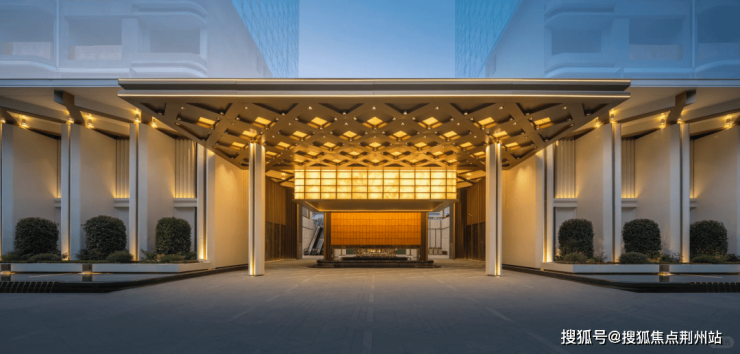 社区主入口以伦敦梅费尔瑰丽酒店为设计原型,打造了气势恢宏的酒店式门仪,200米宽的酒店式门仪,近7米高檐口,16根柱廊排成序列;点睛之笔「明瓦灯笼」,近10米宽、6米高的巨型光影装置,金色雨棚与玉石纹理透光材质巧妙衔接,下方是粼粼水景,光影流转间,直接点亮归家的仪式感。