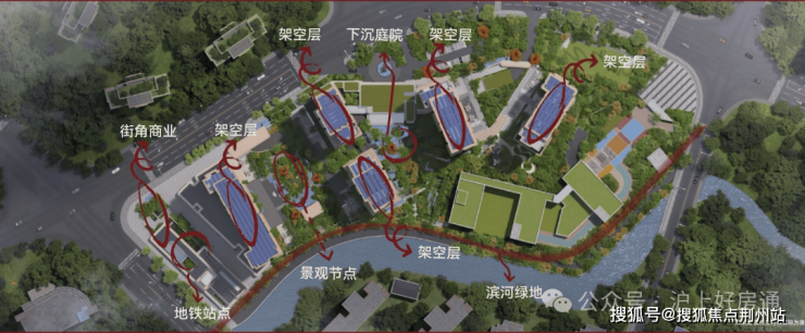 更重要的是,抬升让社区与四周环境产生新的互动:临近的河道,因地势拔高,自然形成对外的景观屏障与观景露台,站在社区内可居高赏河;而社区外看不到内部生活,隐私与景观兼得。