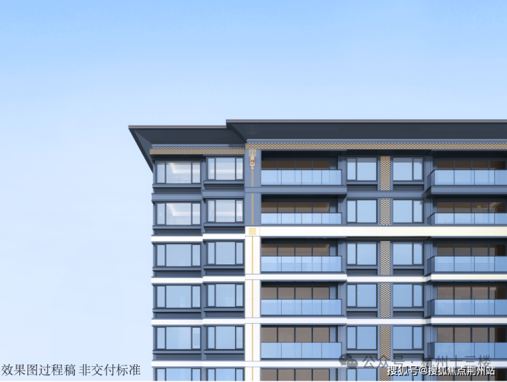 建发▪云栖上宸外立面主要以三面大面铝板+玻璃为主,北立面为涂料,搭配传统飞檐,再用金色云纹装点,颜值高、美观度拉满。