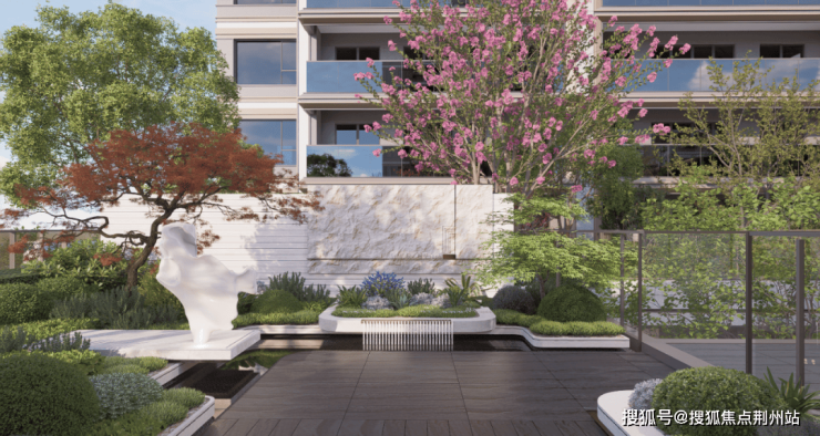 •以“云台”艺术花池串联空间层次,拾级而上,可观细节精工,可驻平台赏景。自上而下的水瀑,贯通上下空间,配合舒展的植物、潺潺水声与轻盈汀步,共同叙写空间的静谧与纯粹。