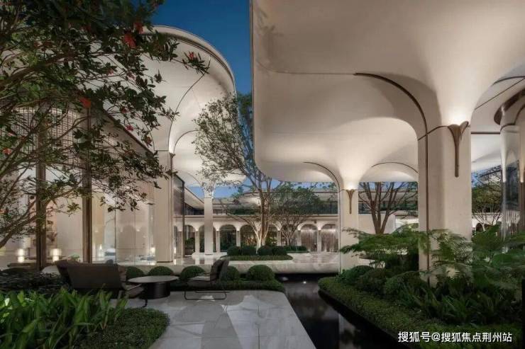 三层归家动线:从地面景观层到架空层,再到入户层,穿越绿植、光影与水景,步步进入私域;搜建筑